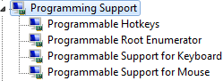 Программная поддержка реализована посредством собственных виртуальных устройств, поэтому к Mad Catz M.M.O. TE Mouse (HID) в разделе «Мыши и иные указывающие устройства» диспетчера устройств добавляется раздел (!) Programming Support, включающий в себя Programmable Hotkeys, Programmable Root Enumerator, Programmable Support for Keyboard и Programmable Support for Mouse.