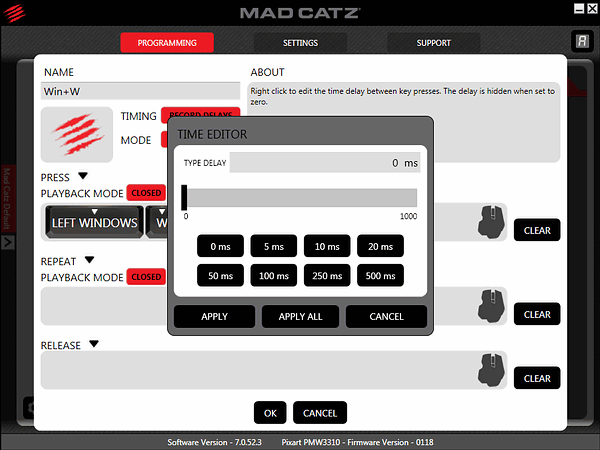Редактор макросов имеет два режима, базовый и продвинутый с обработкой задержек при вводе.