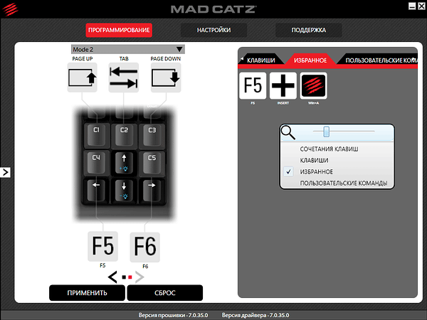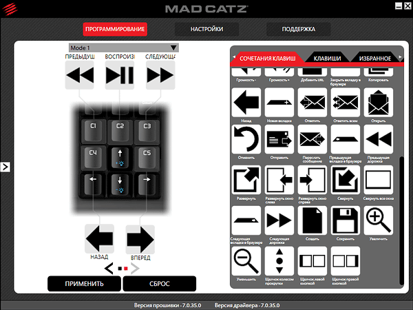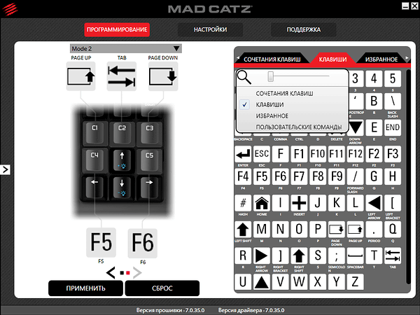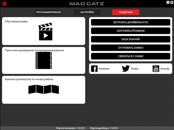 Mad Catz не относится к производителям, стремящимся к унификации ПО для своей периферии, раздел загрузки на официальном сайте предлагает программу и драйверы индивидуально для каждой модели в зависимости от операционной системы.