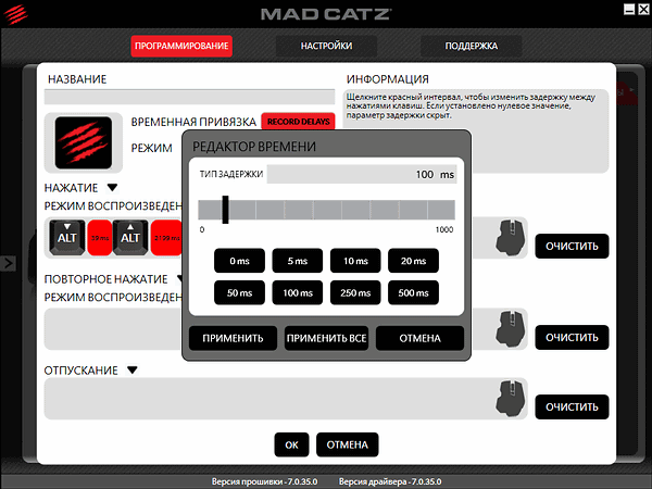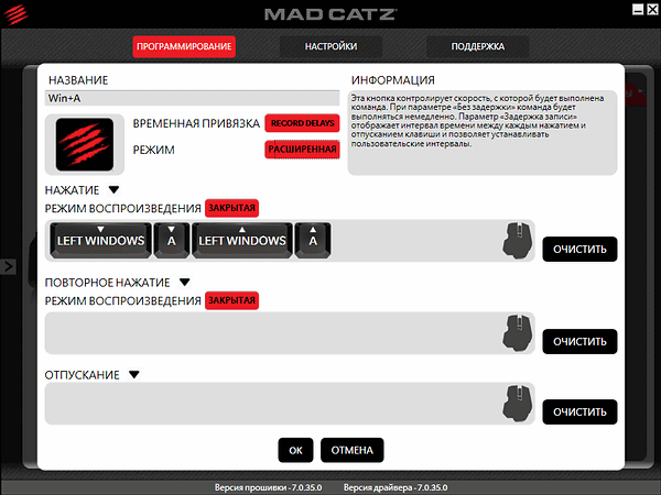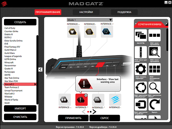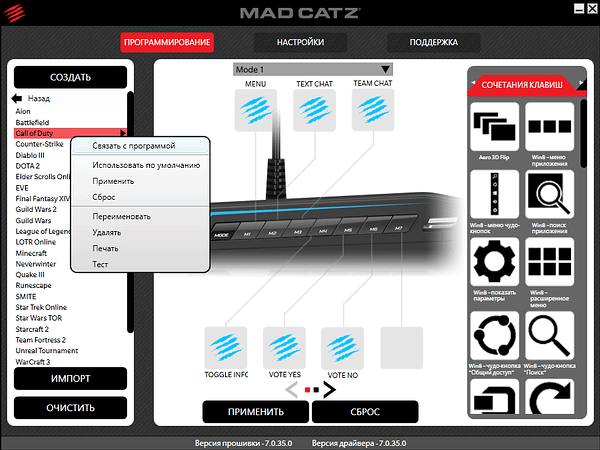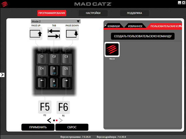 Можно заметить, что штатное ПО от Mad Catz уступает в функциональности, например, программе HERA от GAMDIAS. Больше всего вызывает недоумение отсутствие, казалось бы, давно уже ставшей стандартом де-факто возможности запуска сторонних приложений.