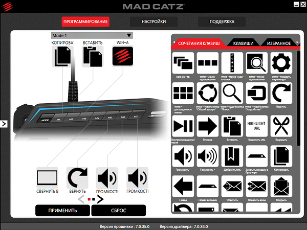 Вкладка «Программирование» позволяет настроить выделенные кнопки для каждого из трех профилей, промаркированных как Mode 1, Mode 2 и Mode 3 в этом же разделе. Для обеих групп настраиваемых кнопок доступны стандартные сочетания (особенно много внимания уделено поддержке Windows 8) и отдельные кнопки, наглядно представленные подписанными пиктограммами.