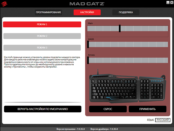 Вкладка «Настройки» отвечает за подсветку для каждого из трех профилей, переключаемых кнопкой MODE.