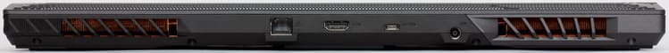 А вот с противоположного торца выведены сетевая розетка RJ45, видеовыход HDMI, порт USB Type-C (3.1 Gen2) и разъём для подключения адаптера питания. Здесь же видны две крупноячеистые вентиляционные решётки системы охлаждения.