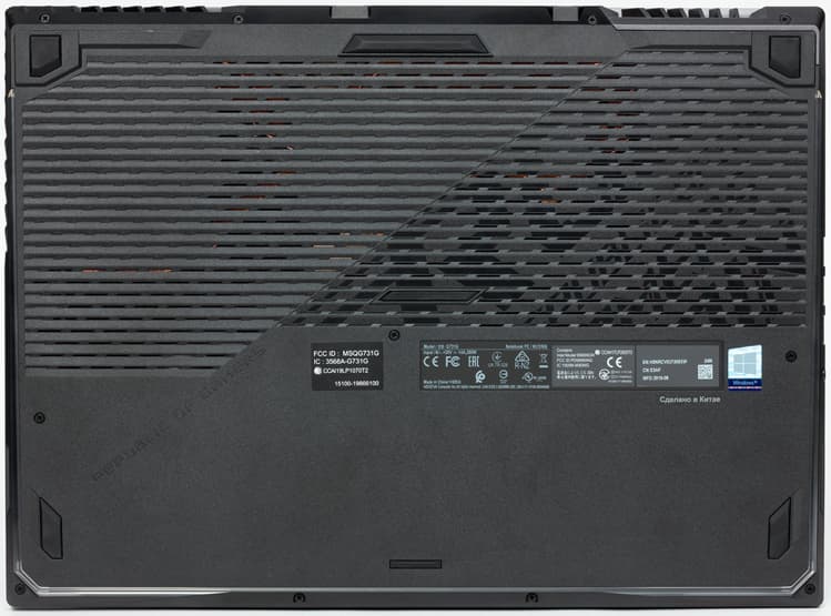 На основании ноутбука – вентиляционная решётка большой площади, резиновые ножки и стикеры с серийными номерами и прочей маркировкой.