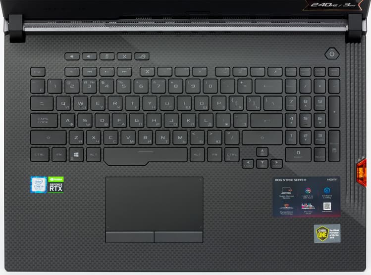 Asus ROG Strix SCAR III G731GW оснащён клавиатурой с блоком цифровых клавиш, пятью функциональными клавишами и кнопкой включения. Ниже расположен классический тачпад размерами 107 × 59 мм с двумя кнопками.