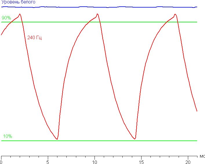Мы определяли полную задержку вывода от переключения страниц видеобуфера до начала вывода изображения на экран (напомним, что она зависит от особенностей работы ОС Windows и видеокарты, а не только от дисплея). При 240 Гц частоты обновления задержка равна 11 мс. Это небольшая задержка, она абсолютно не ощущается при работе за ПК, и даже в очень динамичных в играх не приведёт к снижению результативности.