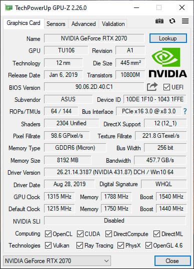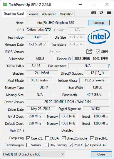 | Видеоподсистема | Nvidia GeForce RTX 2070 (GDDR6, 8 ГБ/256 бит) Intel UHD Graphics 630 | |