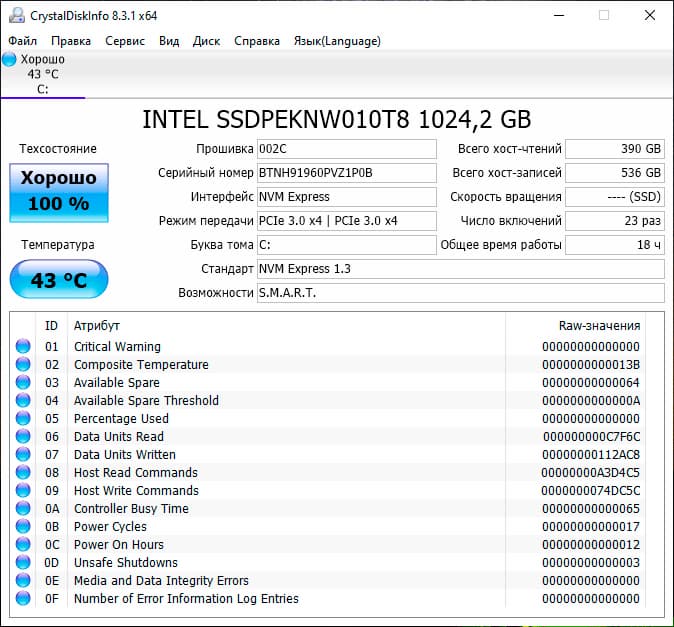 | Накопитель | 1 × SSD 1024 ГБ (Intel SSD 660p, модель SSDPEKNW010T8, M.2 2280, PCIe 3.0 x4) | |