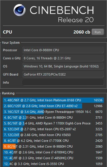 Cinebench R20 (Turbo, от сети)