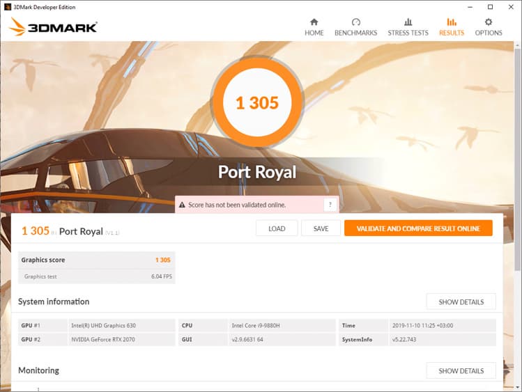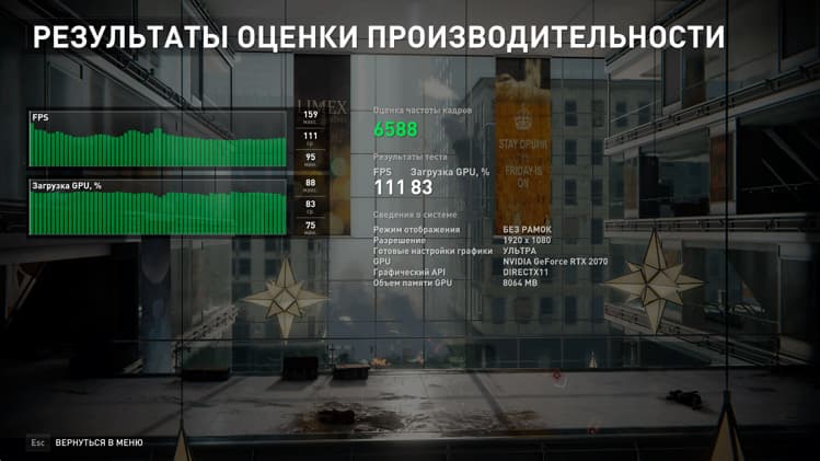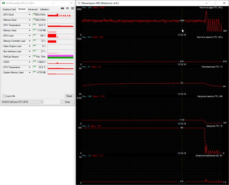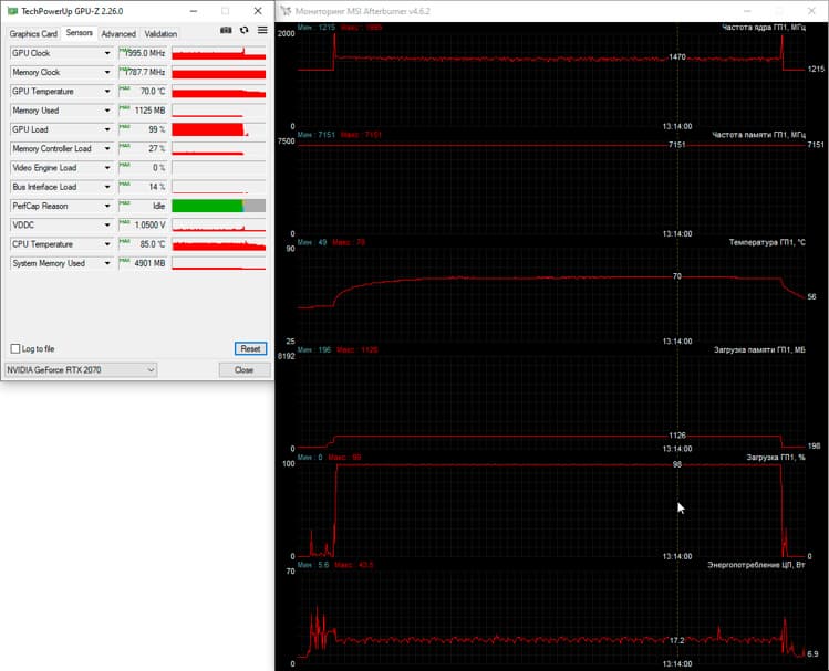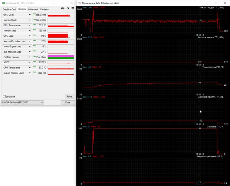 Сразу скажем, что во всех трёх режимах видеопамять GeForce RTX 2070 работала на эффективной частоте 14 ГГц, а вот частота графического процессора была разной. Так в тихом режиме она стабилизировалась на 1215 МГц и максимальной температуре 79 градусов Цельсия, но в этом случае ноутбук действительно работает тихо. В режиме «Сбалансированный» частота GPU изменялась в диапазоне от 1320 до 1380 МГц при максимальной температуре 77 градусов Цельсия, а режим Turbo позволил графическому процессору работать на частотах 1450-1480 МГц, удерживая его температуру в пределах 70 градусов Цельсия. В последнем случае, как мы уже говорили выше, ноутбук становится довольно шумным.