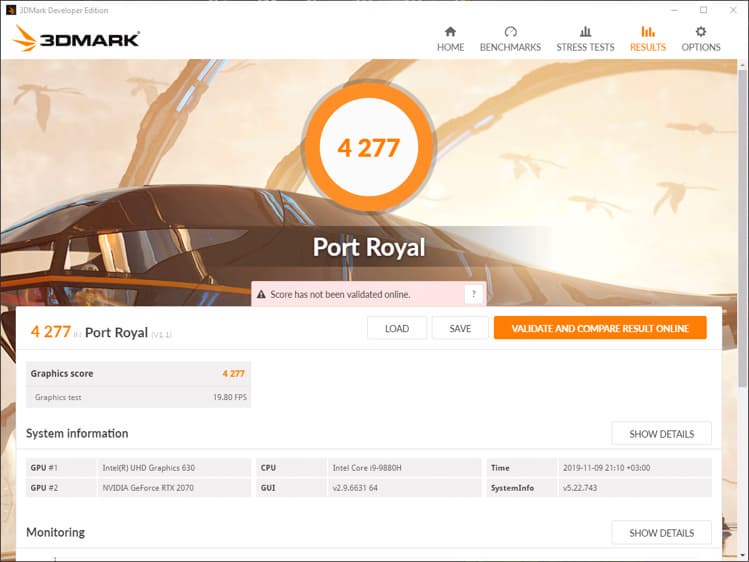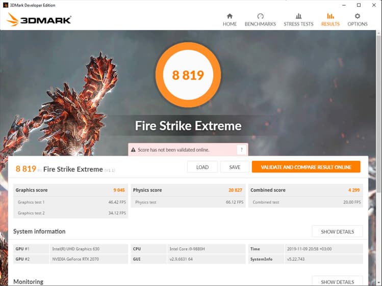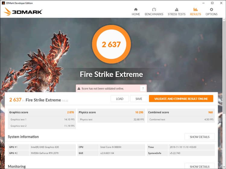 Тестирование графической подсистемы ноутбука мы проводили тестом стабильности Fire Strike Extreme из пакета 3DMark, а для мониторинга использовали программы MSI Afterburner и GPU-Z. Посмотрим на результаты тестирования при питании от электросети.