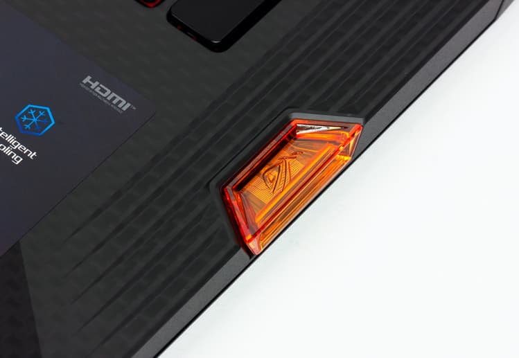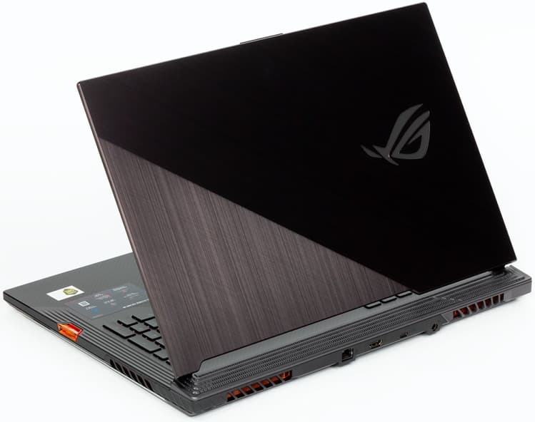 Диагональная текстура внешней поверхности металлической крышки, размещённый там же логотип ROG с подсветкой и выделяющийся оранжевый порт электронного ключа ROG Keystone сразу же позволяют Asus ROG Strix SCAR III G731GW заявить о себе как о ноутбуке премиального уровня.