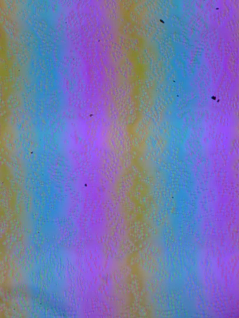 Зерно этих дефектов в несколько раз меньше размеров субпикселей (масштаб этих двух фотографий примерно одинаковый), поэтому фокусировка на микродефектах и «перескок» фокуса по субпикселям при изменении угла зрения выражены слабо, из-за этого нет и «кристаллического» эффекта.