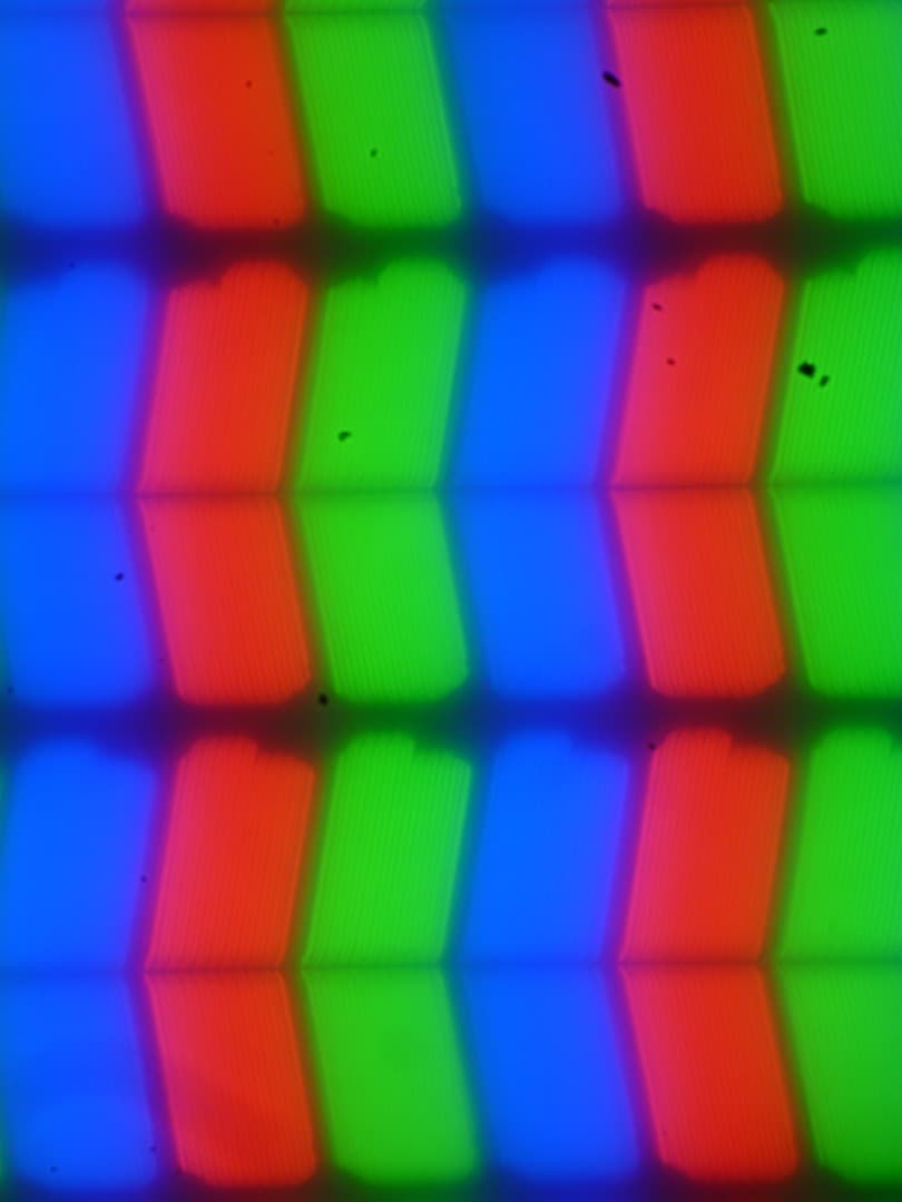 В этом ноутбуке используется матрица типа IPS. Микрофотографии демонстрируют типичную для IPS структуру субпикселей (чёрные точки — это пыль на матрице фотоаппарата):