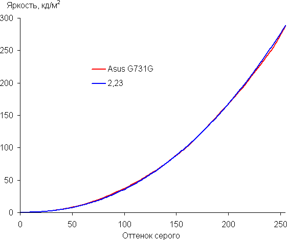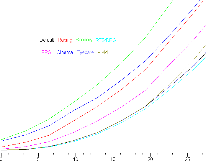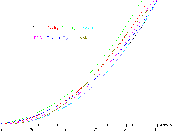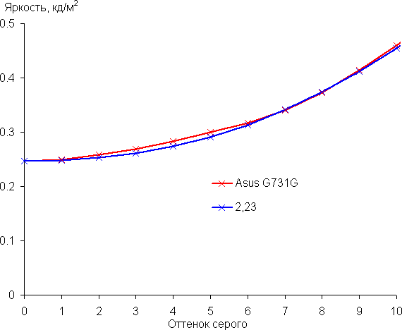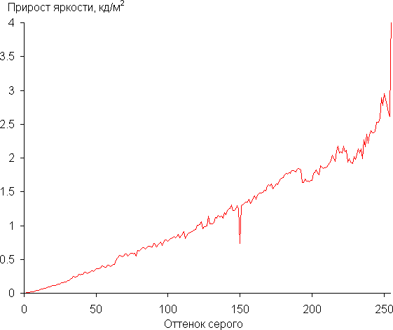 Далее мы измерили яркость 256 оттенков серого (от 0, 0, 0 до 255, 255, 255) при настройках по умолчанию. График ниже показывает прирост (не абсолютное значение!) яркости между соседними полутонами:
