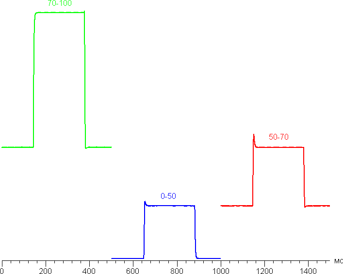 Время отклика при переходе чёрный-белый-чёрный равно 9,8 мс (4,9 мс вкл. + 4,9 мс выкл.), переход между полутонами серого в сумме (от оттенка к оттенку и обратно) в среднем занимает 7,3 мс. Матрица быстрая. Обеспечивается это в том числе за счёт умеренного разгона – на графиках переходов между оттенками мы обнаружили характерные всплески яркости. Например, так выглядят графики для переходов между оттенками 70% и 100%, 0% и 50%, 50% и 70% (по численному значению оттенка):