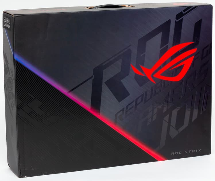 Asus ROG Strix SCAR III G731GW поставляется в большой картонной коробке с логотипом ROG на лицевой стороне и пластиковой ручкой сверху.