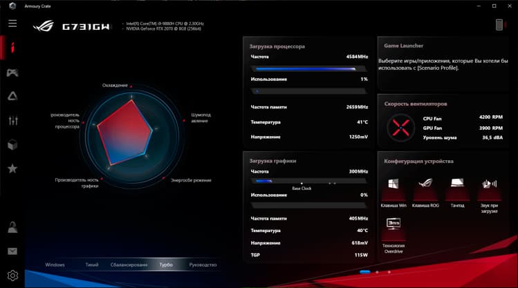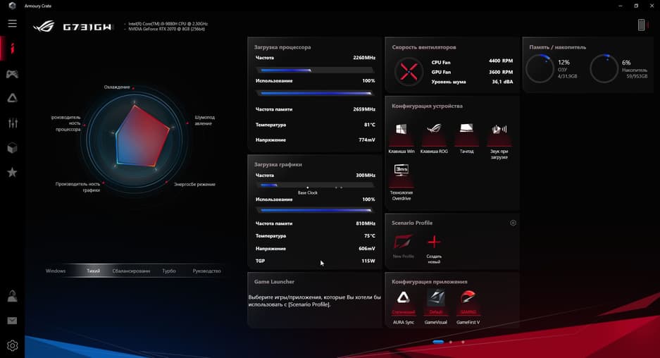 Как и в других ноутбуках Asus ROG Strix SCAR III, в модели G731GW доступны для активации три предустановленных режима работы: «Тихий», «Сбалансированный» и «Турбо». Они могут быть задействованы как с помощью функциональной клавиши над клавиатурой, так и через программное обеспечение Armoury Crate.