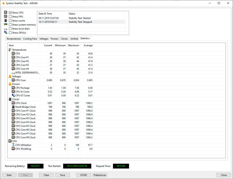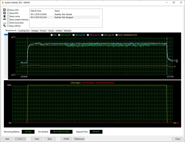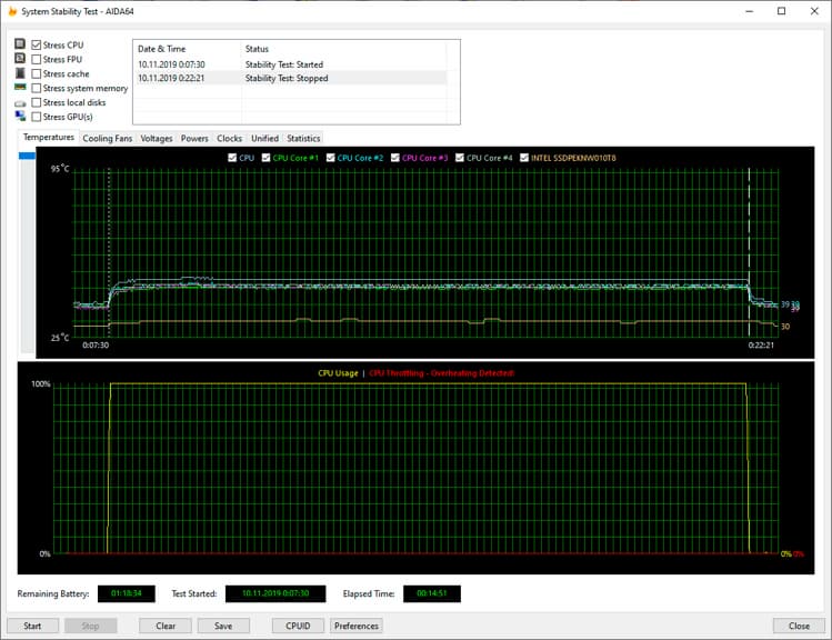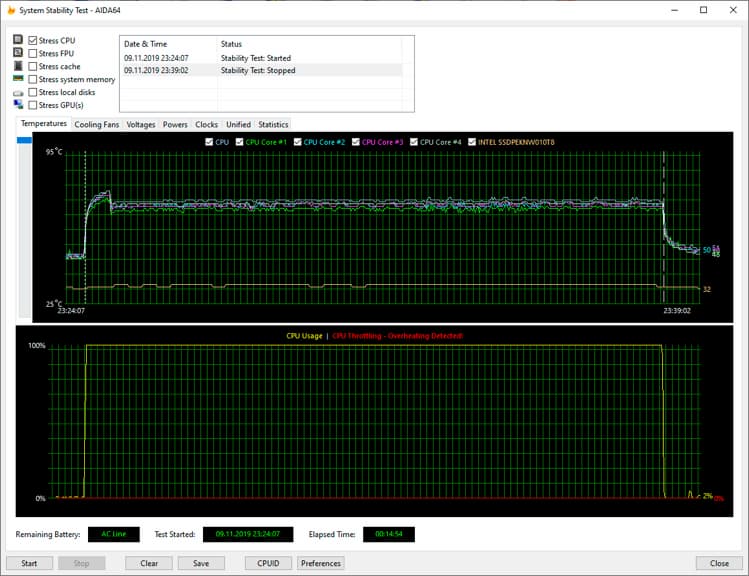 Как и прежде, для проверки работы ноутбука в этих режимах мы использовали стресс-тест CPU из программы AIDA64 Extreme, протестировав все три режима работы ноутбука при подключении к электросети и два режима при питании от аккумулятора (режим Turbo в последнем случае будет недоступен). Все тесты проводились под управлением операционной системы Windows 10 Pro x64 с установкой последних доступных драйверов и обновлений. Температура в помещении во время тестирования находилась у отметки 24 градуса Цельсия.