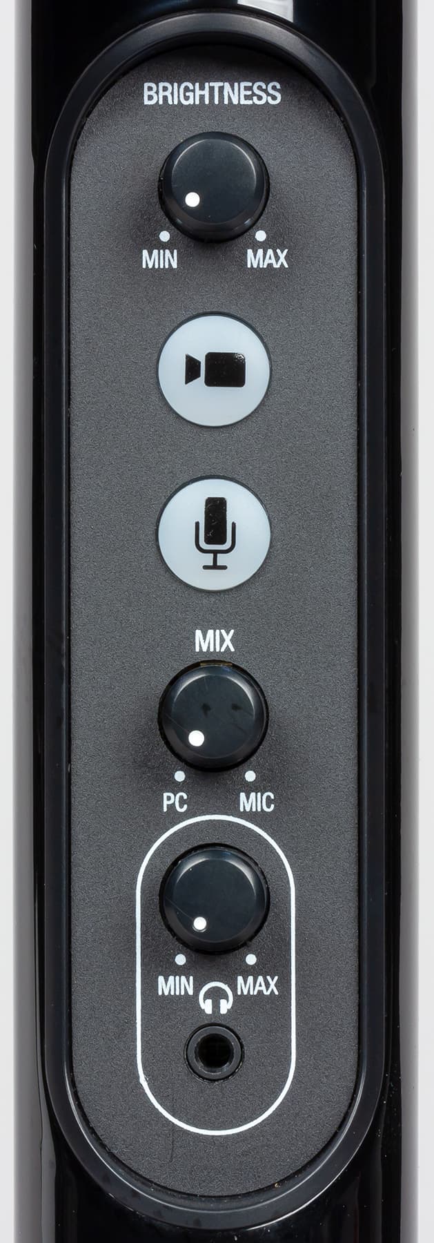 Самая нижняя секция — панель управления системой. Здесь присутствуют: регулировка яркости подсветки; клавиша активации камеры; клавиша активации микрофона; регулировка баланса между звуком микрофона и компьютера; регулировка громкости в наушниках и разъём 3,5 мм для подключения наушников.