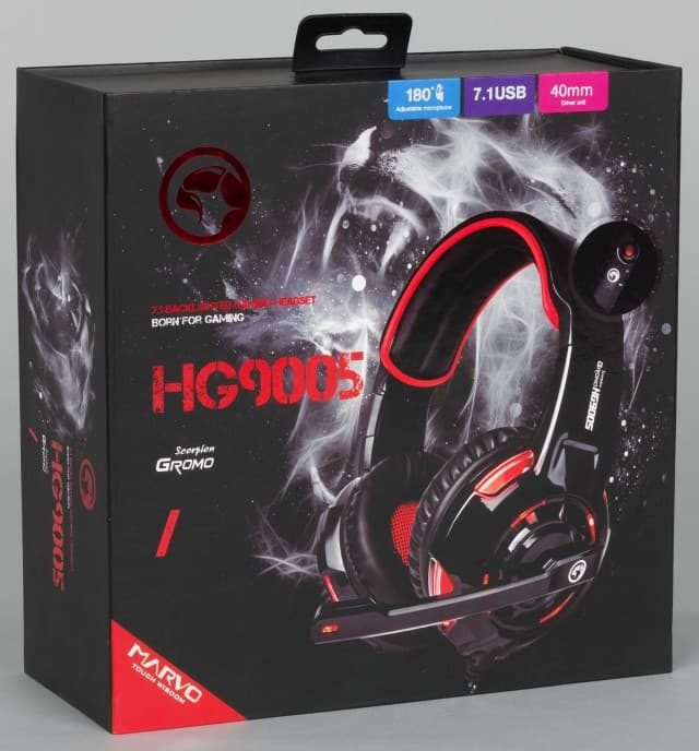 В этом материале мы познакомимся с гарнитурой Marvo HG9005, которая в линейке производителя является одной из двух моделей с объёмным звучанием. Учитывая ценовой сегмент, здесь, конечно, идёт речь о виртуальном режиме 7.1, реализованном с использованием USB-звуковой карты, расположенной на кабеле гарнитуры.