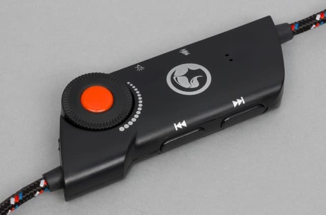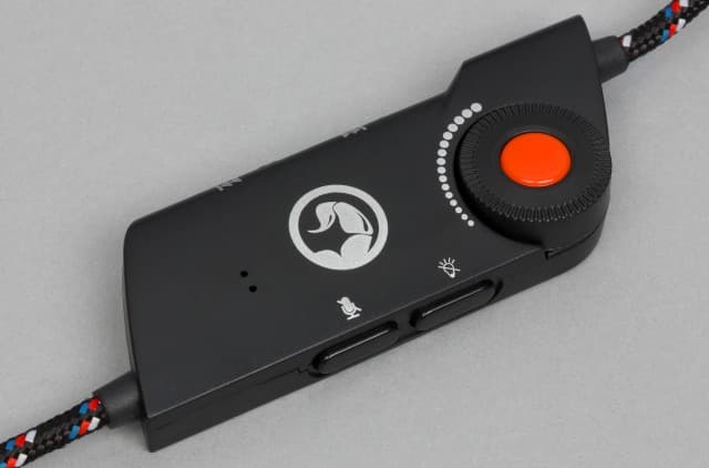 На расстоянии примерно сорока сантиметров от чашки на кабеле установлен блок со звуковой картой и органами управления. Корпус его выполнен из матового чёрного пластика и имеет габаритные размеры около 35x15x85 мм. На лицевой стороне есть логотип компании и пара практически незаметных светодиодов: синий показывает включение питания, а красный — для режима отключения микрофона.