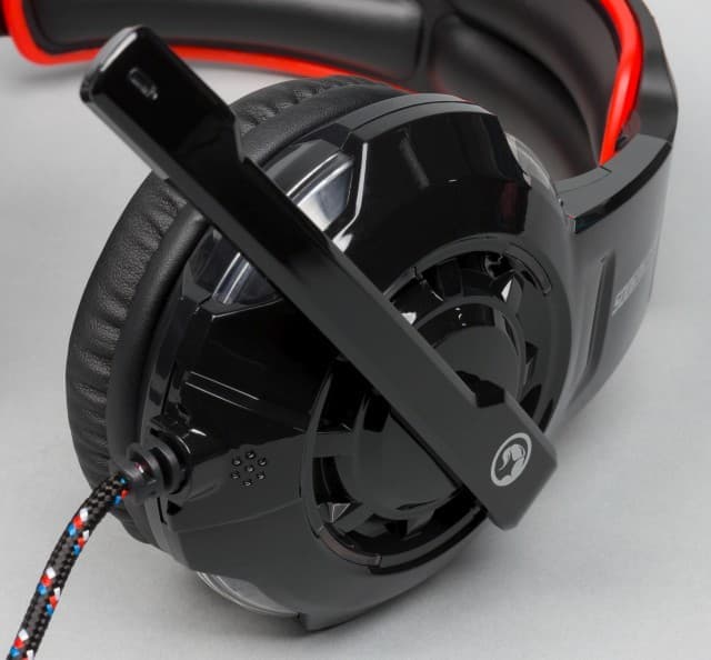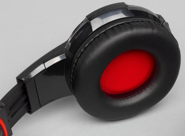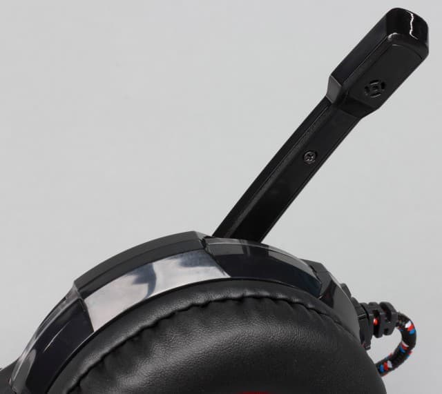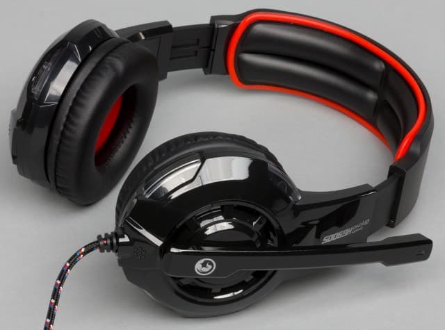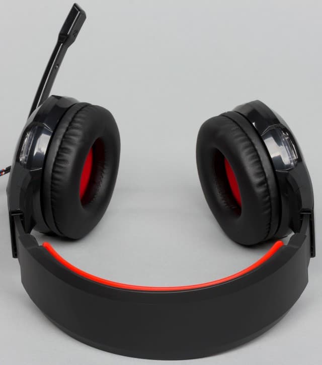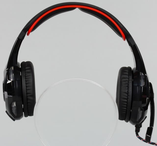 Выбор цветов и материалов характерен для недорогих игровых гарнитур — чёрный пластик с минимумом дополнительных красных элементов. Некоторое разнообразие придаёт отключаемая подсветка красного цвета — по четыре светодиода в чашках светят через прозрачный пластик и ещё один установлен на штанге микрофона. Заметим, что яркость невысокая. Так что днём эффект почти не заметен, зато в темноте не будет мешать окружающим.