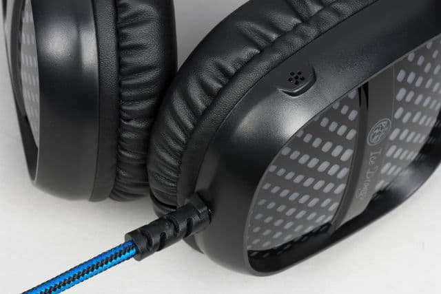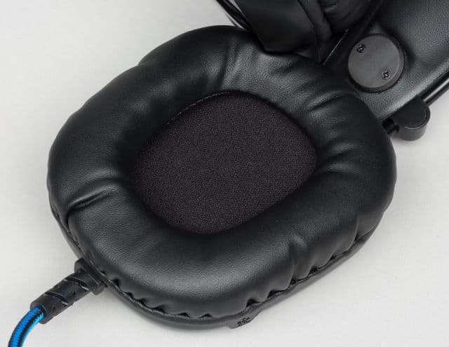 Амбушюры прямоугольной формы сделаны из мягкой синтетической кожи и обеспечивают плотное прилегание к голове слушателя, создавая при этом неплохую звукоизоляцию от окружающего пространства. Гарнитура очень лёгкая, по нашим замерам всего около 244 граммов, поэтому даже при резких поворотах не слетает с головы слушателя.