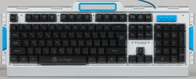 Клавиатура выполнена в так называемом скелетном дизайне, то есть клавиши подняты над верхней панелью. Сама верхняя панель сделана из окрашенного в серый цвет металла. По всем сторонам верхней панели реализованы разной ширины и формы выступы. По всей видимости, это работа дизайнеров. Пластиковые вставки голубого цвета в сочетании с серым цветом верхней панели должны создавать впечатление холода. Собственно отсюда и название серии — Ice Dragon. Эта надпись присутствует на клавише «Пробел», рядом с логотипом в виде хвоста скорпиона.