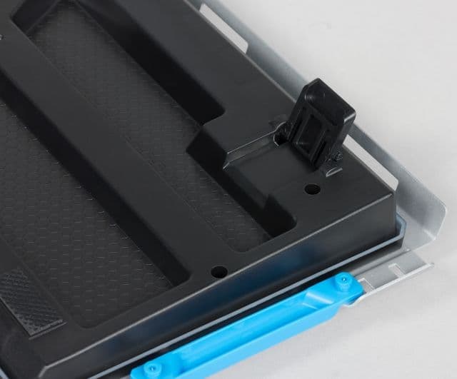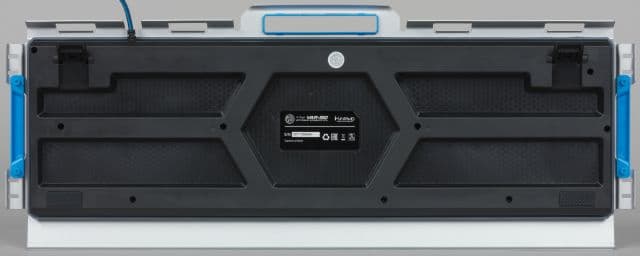 Днище клавиатуры выполнено из пластика с фигурными углублениями. Высота пластика такова, что загнутая к основанию верхняя панель не будет касаться стола, что хорошо, так как такие края могут поцарапать столешницу. Две прямоугольные прорезиненные вставки препятствуют скольжению.