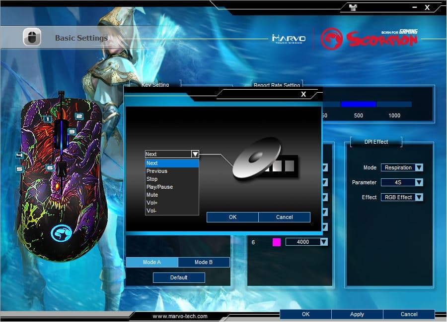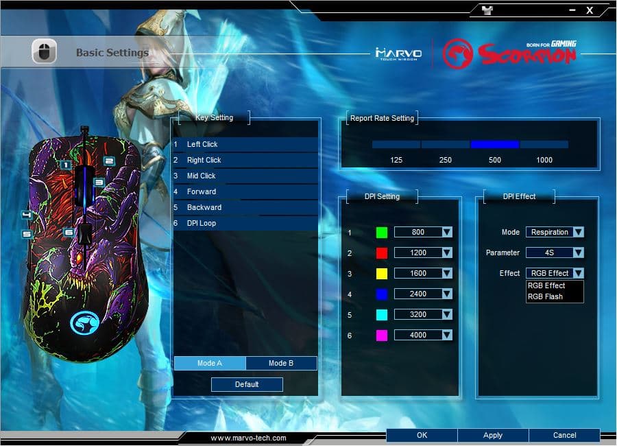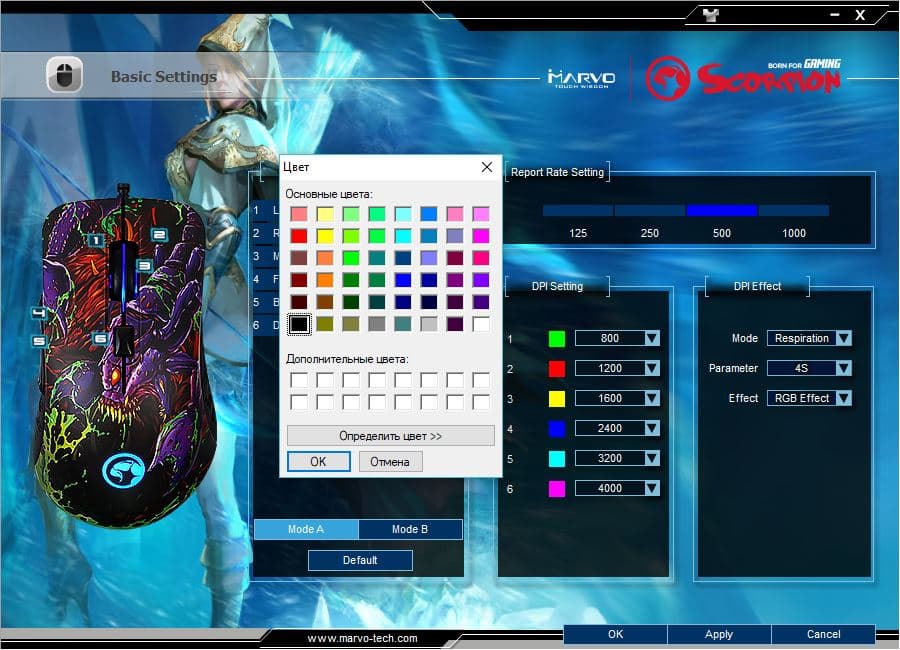 Каждый из 6 шагов DPI можно изменить, однако на выбор доступно относительно небольшое количество значений (400, 800, 1200, 1600, 2000, 2400, 3200, 4000). Кроме этого, на каждый из уровней DPI можно выбрать собственный цвет из RGB-палитры.