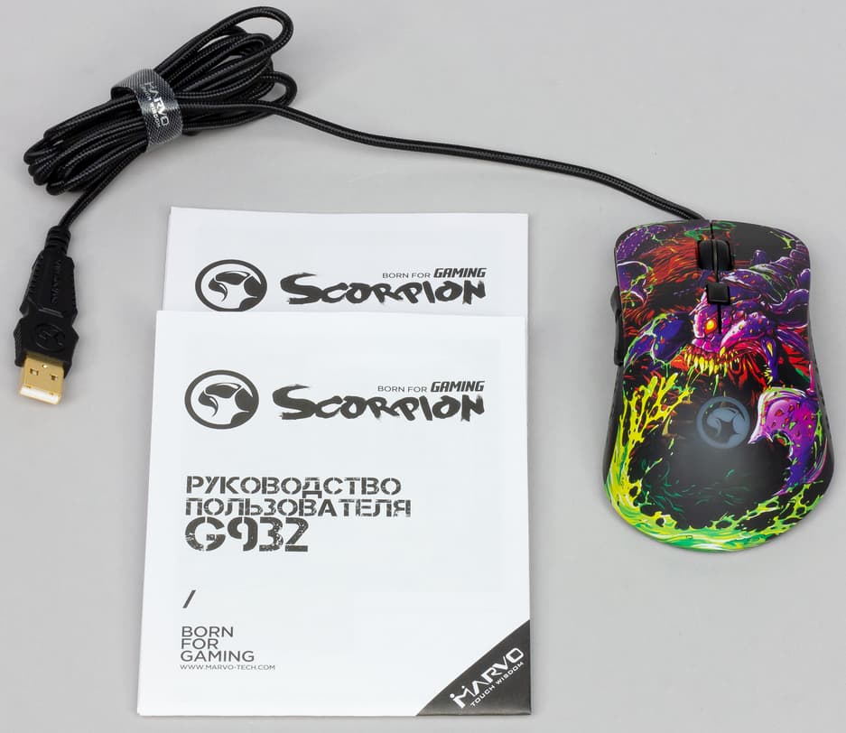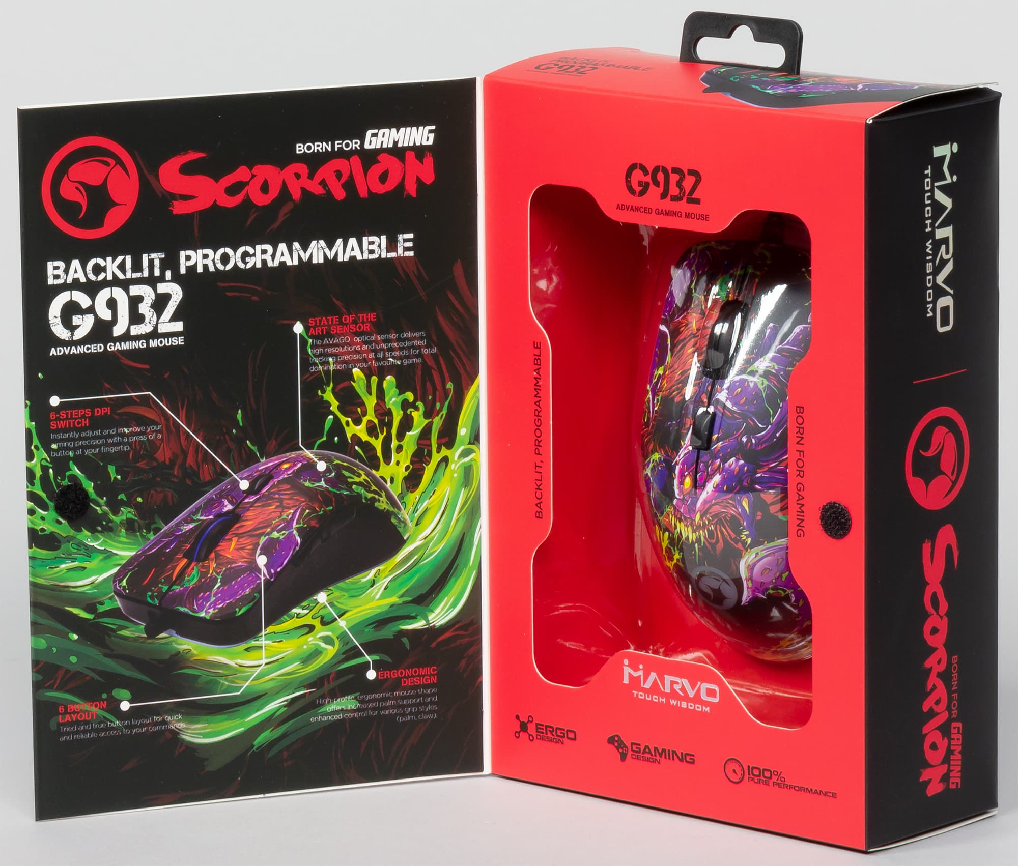 Marvo Scorpion G932 — игровая оптическая мышь с весьма оригинальным дизайном, возможностью настройки DPI и двумя дополнительными клавишами. Также мы обратим внимание на игровой коврик Marvo Scorpion G23, который отлично сочетается с мышью Marvo Scorpion G932 и обеспечивает её безукоризненную работу.