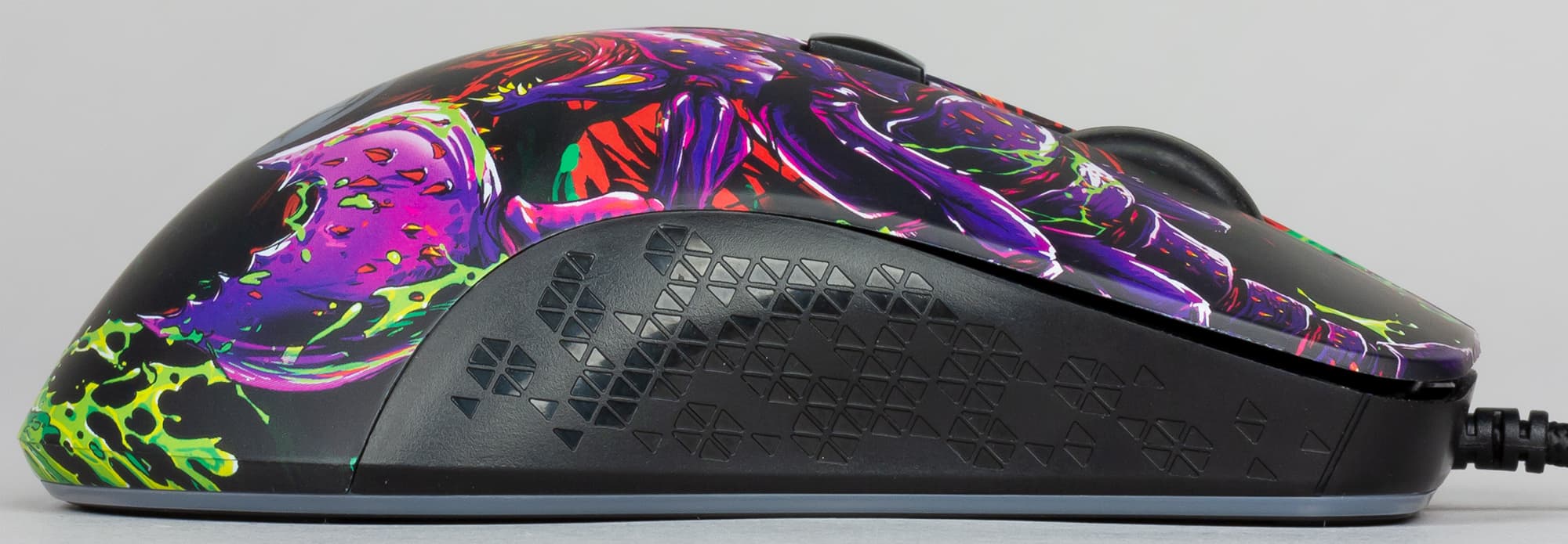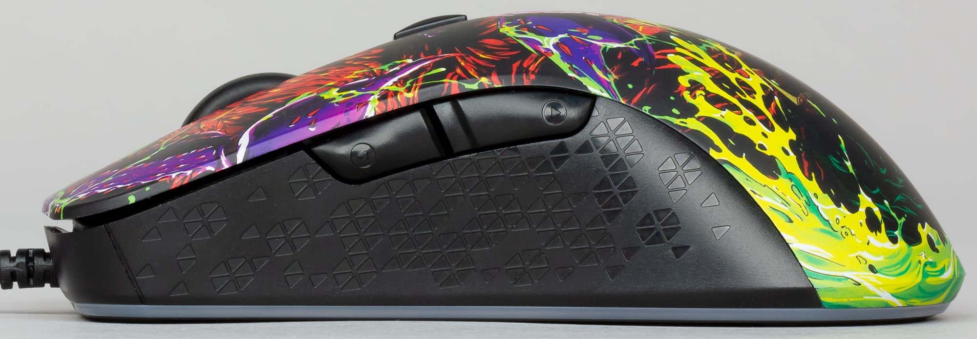 На левой грани мыши расположена текстура, призванная повысить надёжность удержания мыши, привычных прорезиненных вставок нет. В верхней части расположены две выпуклые функциональные клавиши. Ход клавиш средний, щелчок приятный и отчётливый.