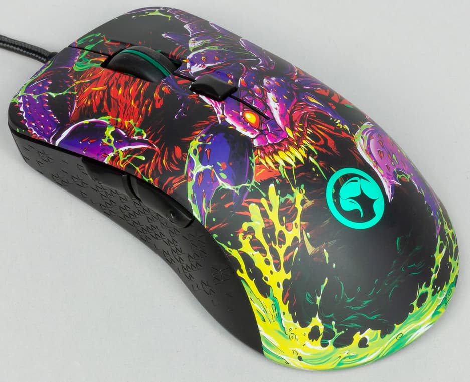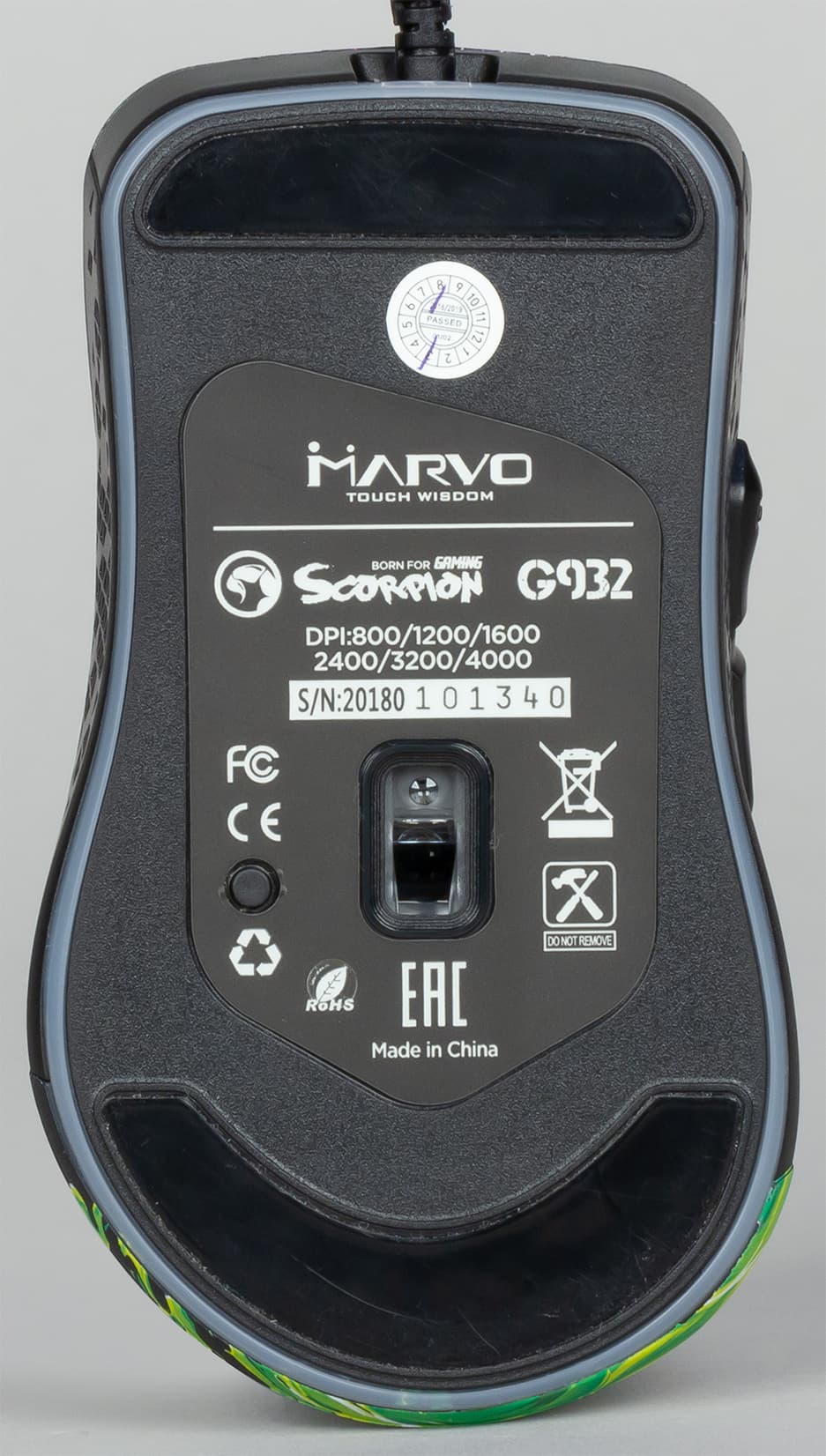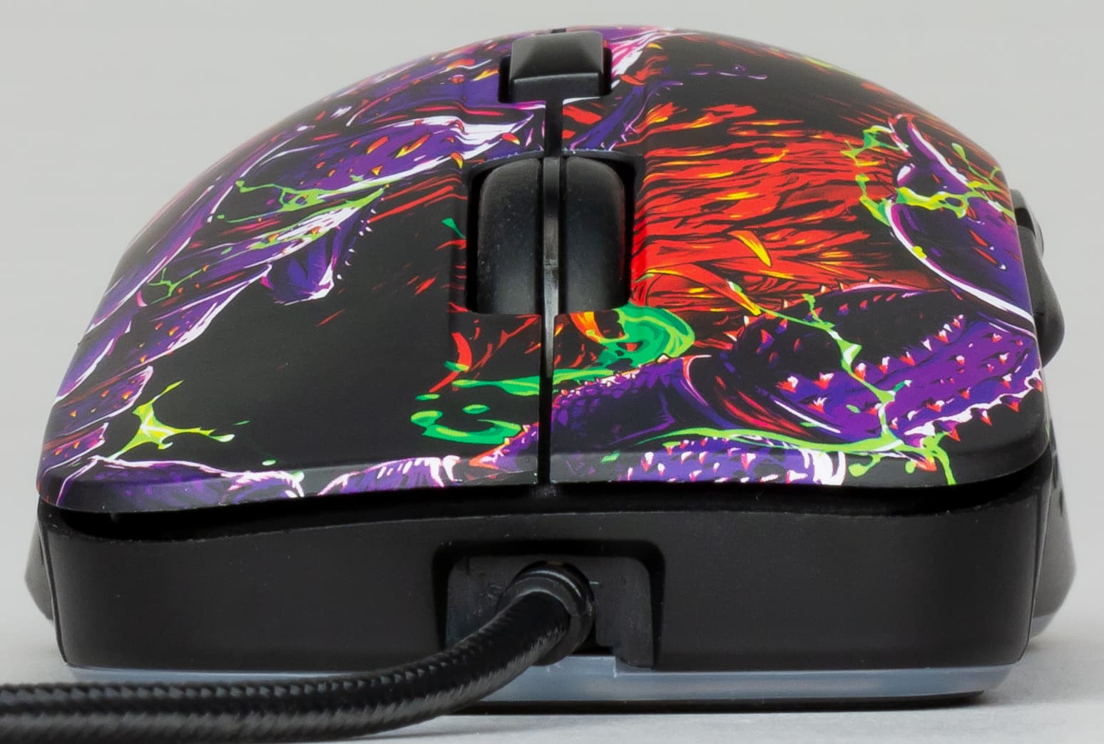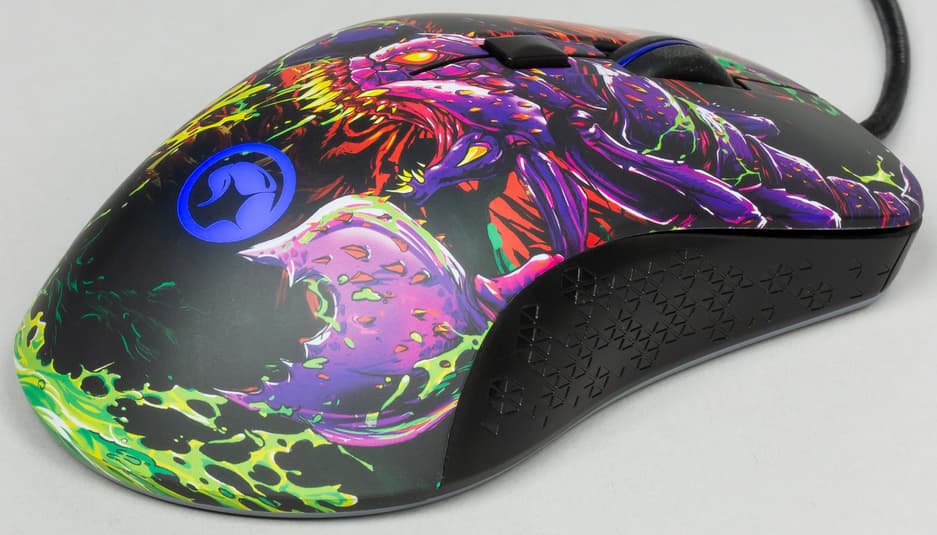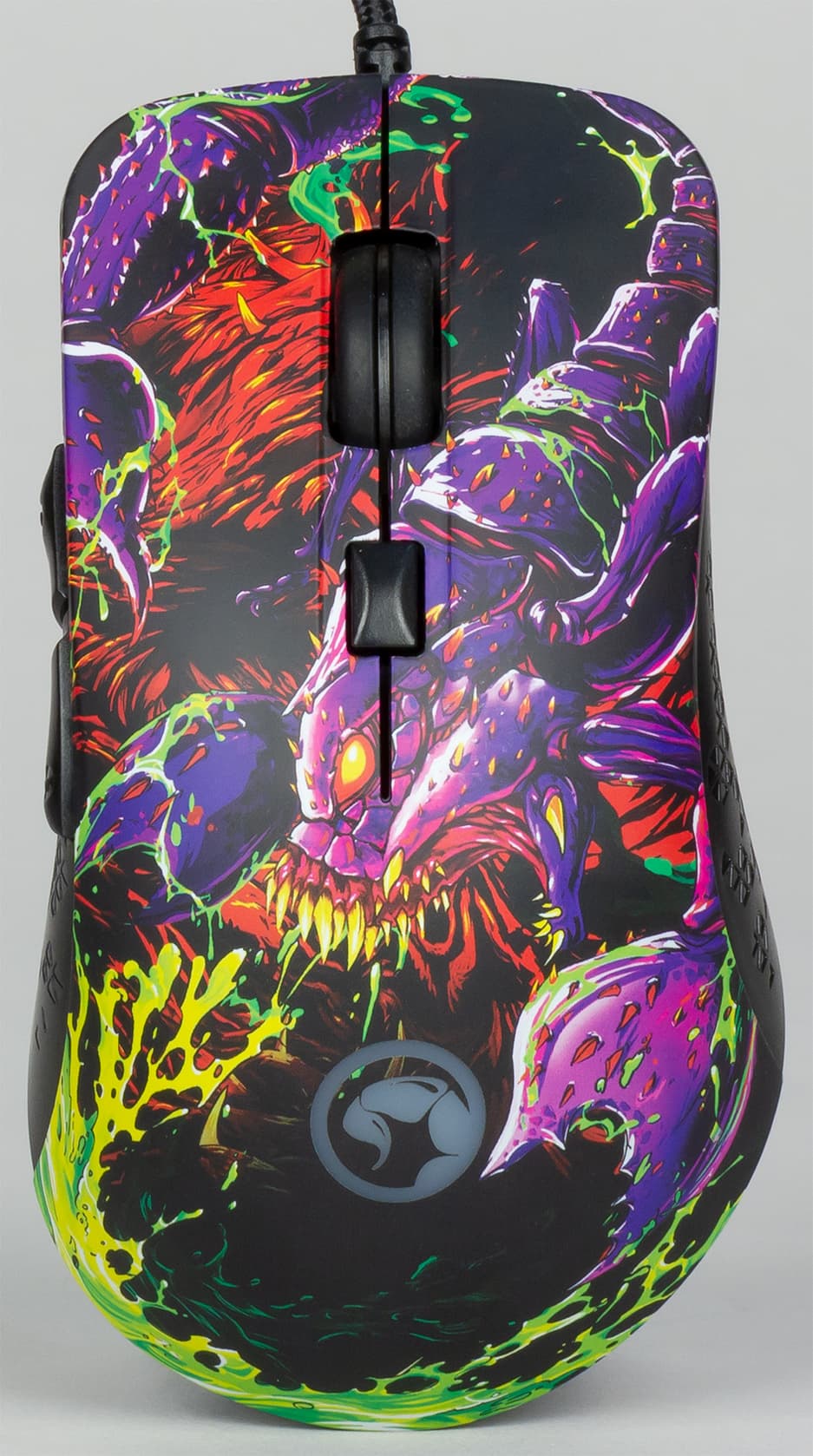 Верхняя часть мыши выполнена из полуматового пластика с изображением скорпиона, являющегося своеобразной фирменной чертой серии. Подобная дизайнерская находка заставляет вспомнить мыши A4Tech с полной запечаткой верхней части и точно понравится многим игрокам. Мышь, благодаря этому решению, выглядит ярко и оригинально.