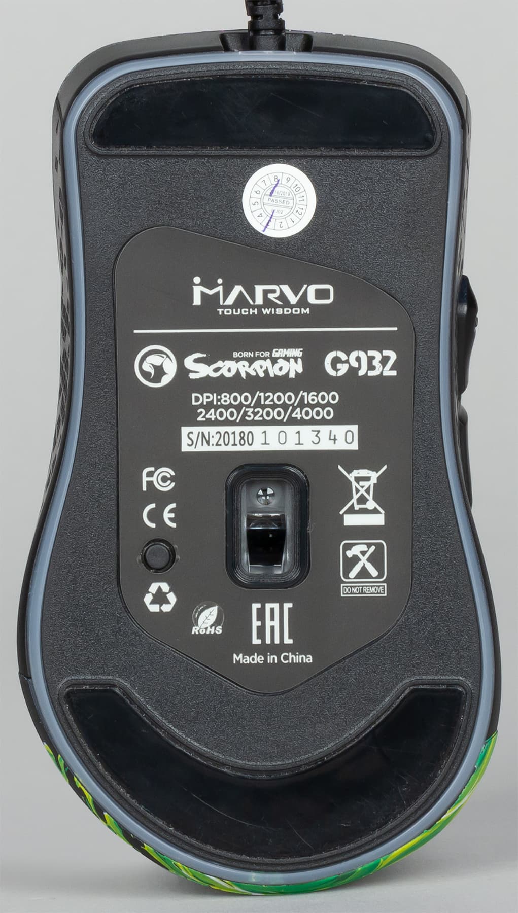 Хорошее скольжение мыши обеспечивают две широкие тефлоновые площадки, между которыми находится оптический сенсор и клавиша отключения подсветки логотипа и колеса прокрутки.