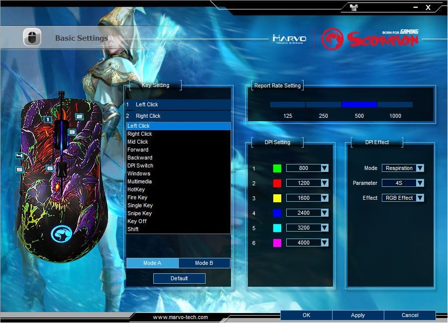 Marvo Scorpion G932 — красивая и удобная игровая мышь, в которой есть все базовые особенности: подсветка, быстрая смена DPI, дополнительные клавиши и настройка с помощью ПО. Более продвинутые вещи, вроде редактора макросов, изменения веса или геометрии корпуса, здесь отсутствуют. Отдельный плюс производителю за клавишу отключения подсветки, которая точно спасёт любителей не выключать компьютер ночью. В многих мышках для отключения подсветки необходимо залезать в приложение.