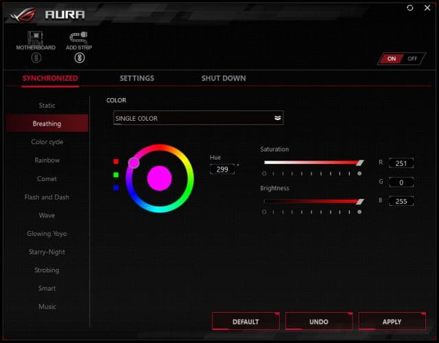 Единственное, что можно отметить, это реализация RGB-подсветки кожуха панели разъёмов. Подсветка кожуха довольно яркая и выразительная. Настраивается подсветка традиционно с использованием утилиты Asus Aura Sync, которая позволяет выбрать цвет подсветки и различные эффекты.