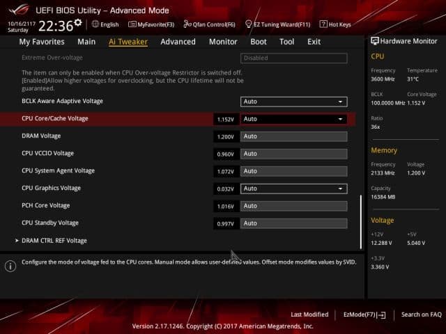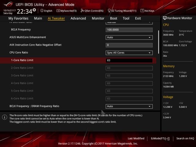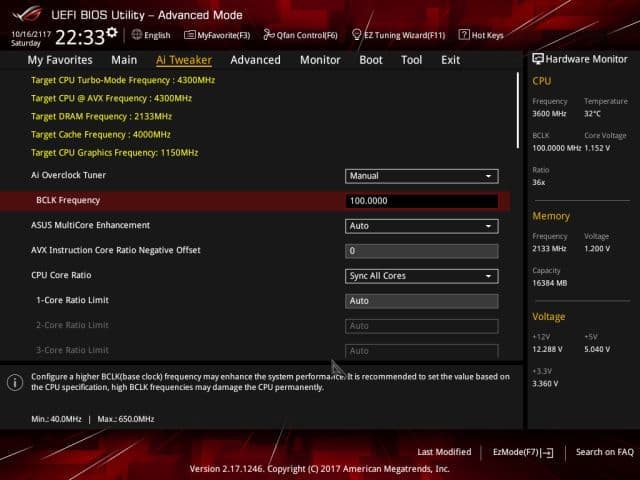 Все настройки, предназначенные для разгона системы, собраны на вкладке Ai Tweaker. На этой вкладке можно поменять частоту BCLK (BCLK Frequency) и коэффициент умножения (CPU Core Ratio).
