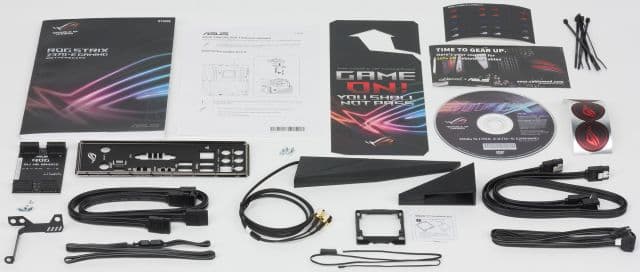 В комплект поставки входит руководство пользователя, DVD-диск с драйверами и утилитами, стикеры для кабелей, четыре SATA-кабеля (все разъёмы с защёлками, два кабеля имеют угловой разъём с одной стороны), заглушка для задней панели платы, мостик SLI на две видеокарты, антенна для Wi-Fi-модуля, кабель для подключения RGB-ленты, кабель для подключения адресуемой RGB-ленты, один термодатчик, набор стяжек для проводов, держатель для установки на плату дополнительного вентилятора размером 40×40 или 50×50 мм (сам вентилятор в комплект не входит) и пластиковая рамка для безопасной установки процессора в разъём.