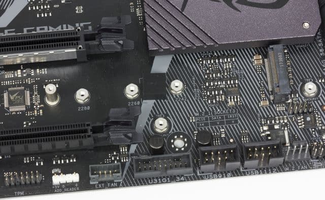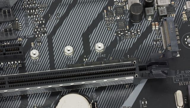 Кроме слотов PCI Express, на плате имеется два разъёма M.2, которые предназначены для SSD-накопителей с типоразмером 2242/2260/2280. Один разъём (M2_1) поддерживает накопители с интерфейсом PCIe 3.0 x4 и SATA, а другой (M2_2) — только накопители с интерфейсом PCIe 3.0 x4.