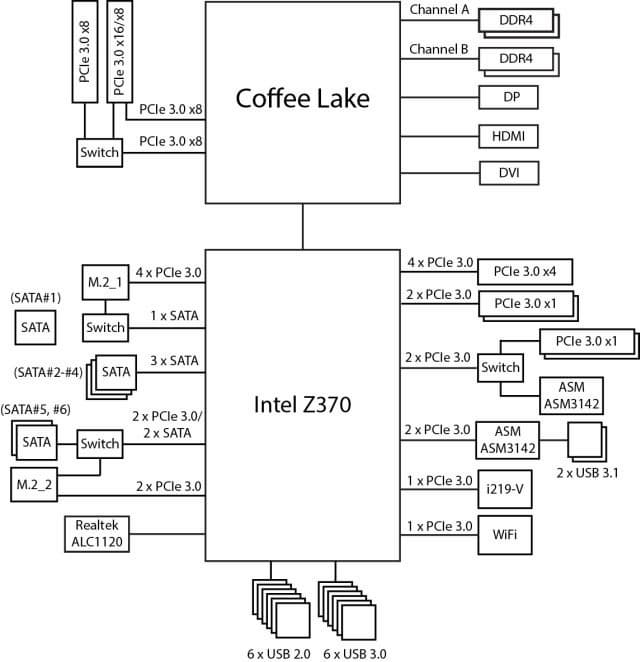 Напомним, чипсет Intel Z370 имеет 30 высокоскоростных портов ввода/вывода (HSIO), в качестве которых могут быть порты PCIe 3.0, USB 3.0 и SATA 6 Гбит/с. Часть портов строго фиксированы, но есть HSIO-порты, которые могут конфигурироваться как USB 3.0 или PCIe 3.0, SATA или PCIe 3.0. Причём всего может быть не более 10 портов USB 3.0, не более 6 портов SATA и не более 24 портов PCIe 3.0.