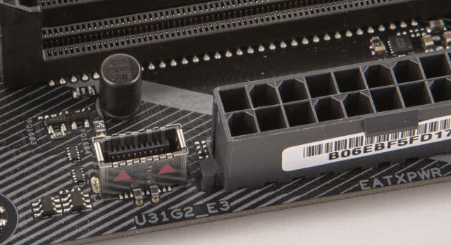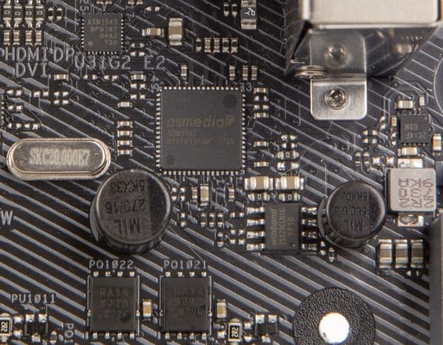 Кроме того, один контроллер ASMedia ASM3142, на базе которого реализован вертикальный разъём для подключения фронтального порта USB 3.1, разделяется с двумя слотами PCI Express 3.0 x1 (PCIE_x1_2 и PCIE_x1_4). Режим работы (слоты PCIE_x1_2 и PCIE_x1_4 или контроллер ASMedia ASM3142) задаётся в настройках BIOS.