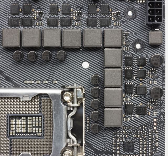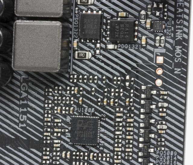 Как и большинство плат, модель Asus ROG Strix Z370-E Gaming имеет 24-контактный и 8-контактный разъёмы для подключения блока питания. Регулятор напряжения питания процессора на плате управляется PWM-контроллером ASP1400BT в сочетании с шестью MOSFET-драйверами. В самих каналах питания используются MOSFET-транзисторы SiRA12DP и SiRA14DP компании Vishay Intertechnology.
