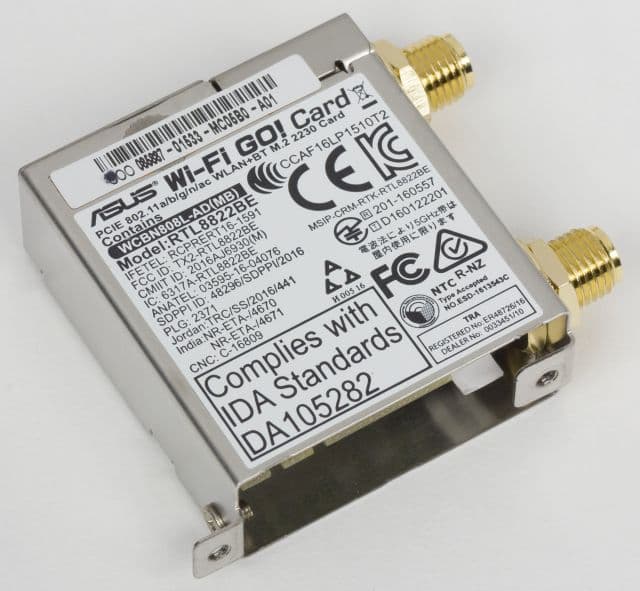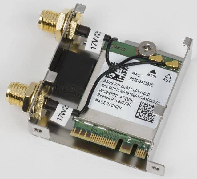 Для подключения к сети на плате Asus ROG Strix Z370-E Gaming предусмотрен гигабитный сетевой интерфейс и беспроводной интерфейс Wi-Fi 802.11b/g/n/ac. Гигабитный сетевой интерфейс реализован на базе контроллера физического уровня Intel I219-V (используется в сочетании с чипсетным контроллером MAC-уровня). Модуль Wi-Fi основан на базе контроллера Realtek RTL8822BE. Этот модуль устанавливается в разъём M.2 вертикального типа.