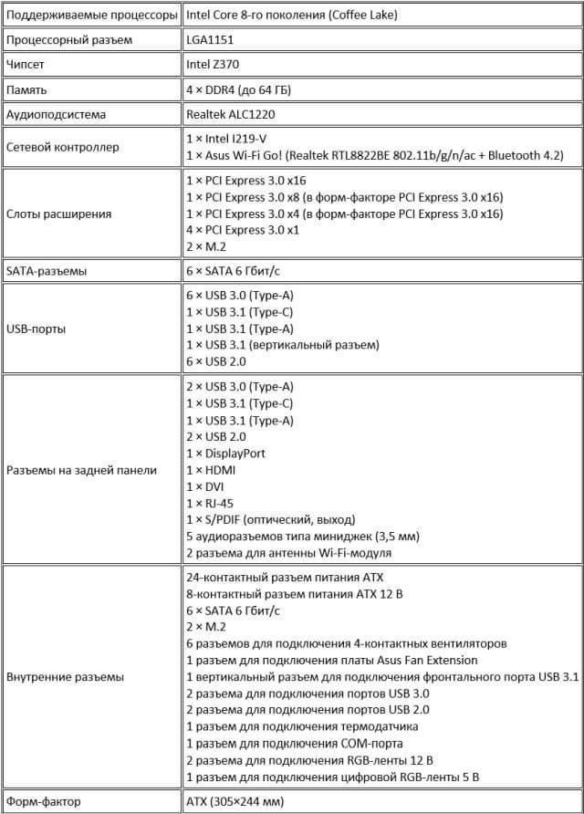 Сводная таблица характеристик платы Asus ROG Strix Z370-E Gaming приведена ниже, а далее мы рассмотрим все её особенности и функциональные возможности.