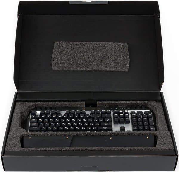 Габариты объясняются использованием упаковочного пенополиуретана, что называется, с избытком. Клавиатура и размещенная отдельно подставка для рук гарантированно защищены от возможных повреждений при транспортировке.