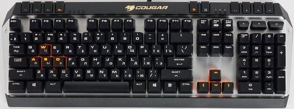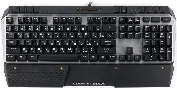 Cougar 600K имеет типичную для представленных на отечественном рынке механических клавиатур раскладку с длинными кнопками Shift и узким Enter, поклонники Г-образного «Ввода» не являются целевой аудиторией устройства. Пробел имеет привычный вид, спорное разделение его на две части осталось за Cougar 700K.