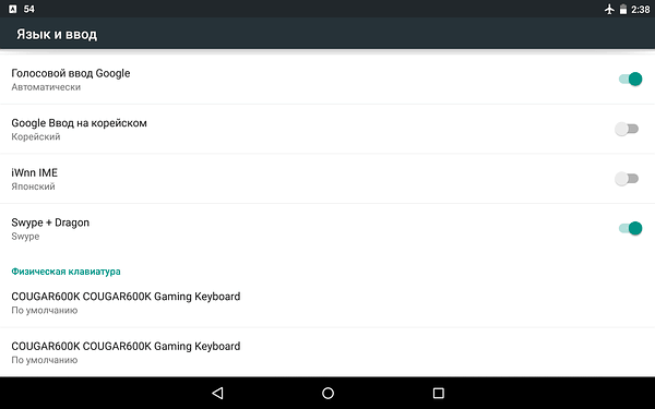 При подключении к планшету ASUS Nexus 7 2013 (версия Android 5.0.2) через кабель OTG модель Cougar 600K определяется как две COUGAR600K COUGAR600K Gaming Keyboard, вероятно, из-за поддерживаемого количества одновременных нажатий.