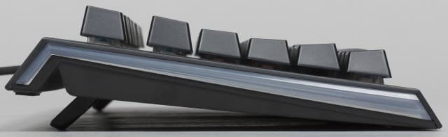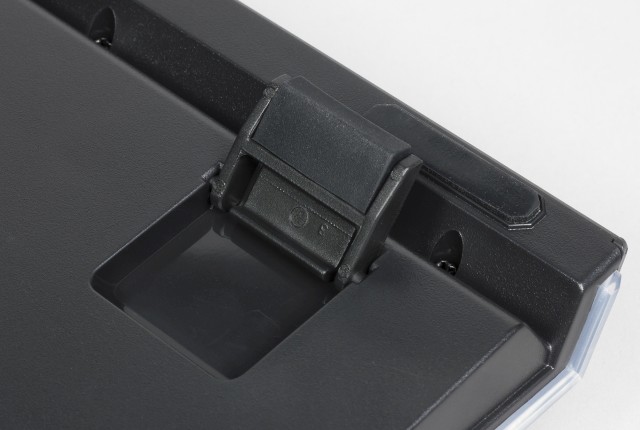 Впрочем, в дополнение к внушительной массе на её днище по углам размещены четыре прорезиненные полоски, препятствующие скольжению. Две откидные ножки позволяют изменить угол наклона относительно поверхности стола, приподняв дальнюю от пользователя сторону клавиатуры.
