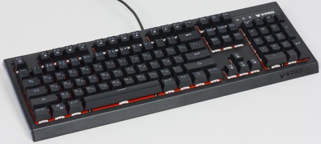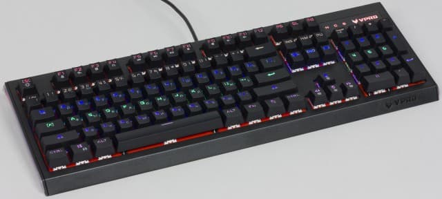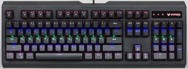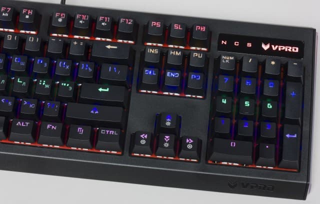 В правом верхнем углу клавиатуры расположены индикаторы состояния Num Lock, Caps Lock и Scroll Lock, а также логотип Vpro, подсвечиваемый красным цветом.